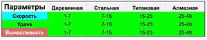 | Параметр | Деревянная | Стальная | Титановая | Алмазная |