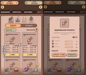 - Перейдите во вкладку Лопата (4) → Купить (5)