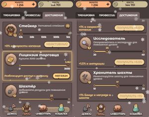 | Шахтёр | +0.5% скорости | 5, 10, 30, 100, 250, 500, 1000, 2000, 5000, 10000 |